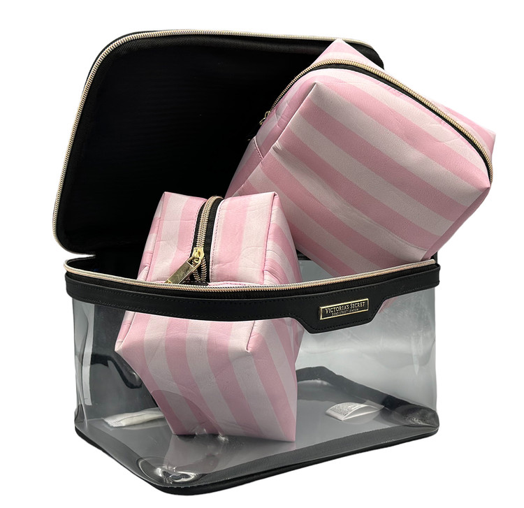 کیف آرایشی ویکتوریا سکرت سه تکه طلقی فوق دارای دو کیف آرایشی جداگانه از جنس ساتن ضخیم با کیفیت و یک کیف آرایشی طلقی بزرگ که دارای دسته میباشد